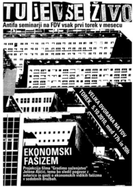 Na Fakulteti za družbene vede je potekal antiFA seminar na temo ekonomskega fašizma. Dogodek je bil prvi v nizu antiFA srečanj, ki bodo v letošnjem šolskem letu potekala na FDV-ju. Zadeva se je razvila iz Dneva antifašizmov 18. maja letos, ko so na pobudo zaposlenih in študentov fakultete zaradi vse pogostejših izpadov homofobnega in ksenofobnega nasilja potekala predavanja, pogovori in delavnice na temo sodobnih oblik fašizma. Da pa o tej temi ne bi komunicirali samo ob dnevu tega ali onega, zdaj dogodki dobivajo bolj frekventno, torkovsko obliko. Vsak prvi torek v mesecu se bodo namreč med 17. in 20. uro na FDV-ju odvijale projekcije filmov, diskusije, predavanja in delavnice, ki bodo pod drobnogled vzele takšne ali drugačne oblike sodobnih fašizmov.
